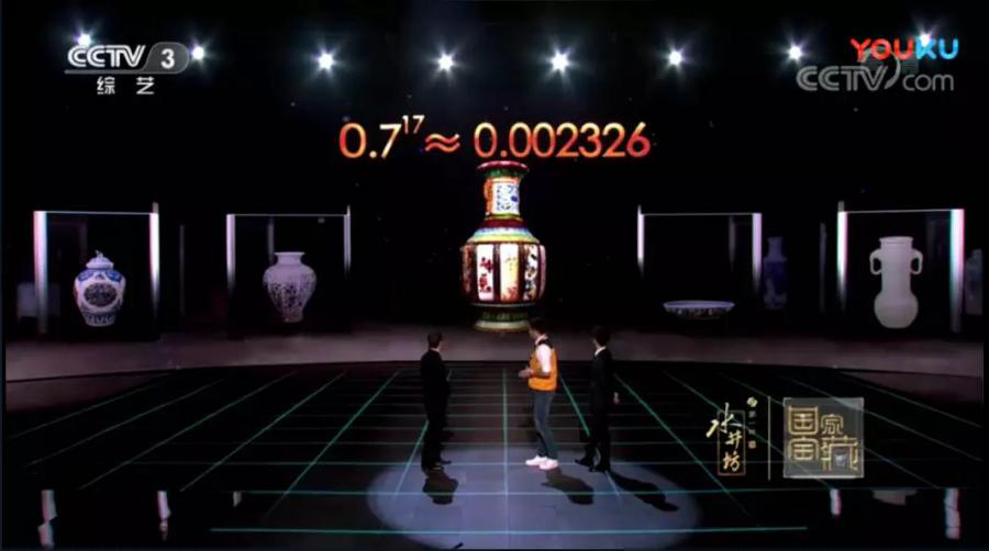 前世故事讓人捧腹,大瓶的今生故事則讓人瞠目。故宮號(hào)稱“問不倒”的講解員張甡把大瓶上的各種釉彩從上到下17種釉彩、紋樣以及燒制的溫度介紹了一遍,然后給大家算了算,燒成這樣一件大瓶的成功率:假設(shè)將每一種釉彩的成功率往高了算,按70%算,17種釉彩同時(shí)完美燒制的概率: